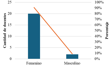 La mayor cantidad de docentes (20) que corresponde al 91% son mujeres y el 9 % restante son hombres (2), lo que muestra un claro predominio del género femenino sobre el masculino, un dato consistente con el hecho de que en gran parte de los países latinoamericanos existe una “feminización del magisterio primario” (Fiorucci et al., 2021).