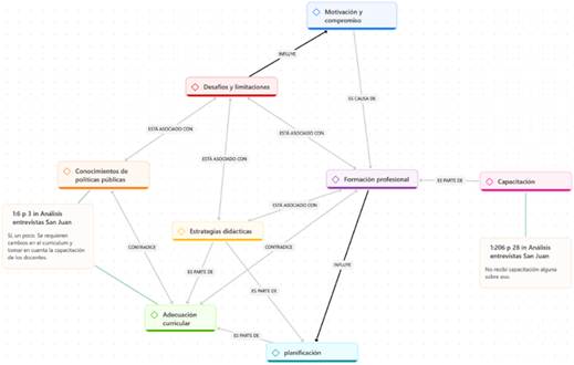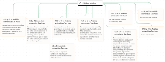 La red plasmada en la Figura 10 indica que los docentes tienen un conocimiento limitado o nulo sobre las políticas públicas de educación inclusiva en el país. Aunque mencionan que existe un mandato de inclusión, este no está acompañado de los recursos o la capacitación para implementarlo efectivamente.