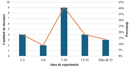 La Figura 2 permite apreciar que el 41% de los docentes oscila entre 7 y 10 años de experiencia, seguido de quienes están en un rango de entre 1 y 3 años y aquellos con 11 y 15 años de desempeño, cada grupo representa un porcentaje 18% respectivamente. Finalmente, el 14% supera los 15 años de servicio y en menor proporción, el 9% posee entre 4 y 6 años dedicados a la enseñanza. Esto indica que tienen distintos niveles de experiencia en torno a la atención de estudiantes con discapacidad, dados los cambios en cuanto a normas y directrices generadas desde los organismos competentes.