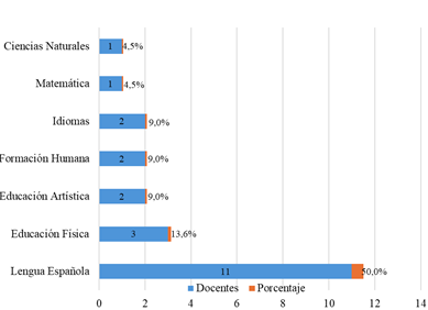 El total de asignaturas impartidas por los docentes son siete, con un predominio de Lengua Española con el 50% de los seguida de Educación Física con 13,6%, el resto de las asignaturas (Educación Artística, Idiomas, Formación Ciencias Naturales, Matemáticas) abarcan el porcentaje restante. Cada asignatura plantea una exigencia para el docente en cuanto a las adaptaciones que debe hacer para que el estudiante de primaria con discapacidad adquiera las competencias esperadas según el diseño curricular (MINERD, 2016a, 2016b).