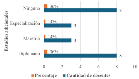 En relación con los estudios profesionales, adicionales al grado de licenciatura, el 36% de los docentes no ha realizado ninguno, el 36% tiene diplomados, estos son considerados cursos de ampliación según la Ley 139-01 de Educación Superior, Ciencia y Tecnología (2001); solo el 28% tiene estudios de postgrado en maestría y especialización según la Clasificación Internacional Normalizada de la Educación (Unesco, 2011).