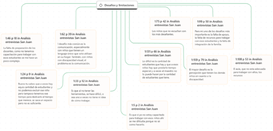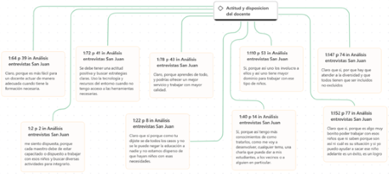 Las respuestas obtenidas en las entrevistas se agruparon en 6 códigos que expresan los puntos de vista de los docentes acerca de sus competencias para la atención a los estudiantes con discapacidad. Estos se muestran a través de las redes creadas en Atlas. TI en las cuales se incluyen los fragmentos textuales de las respuestas dadas por los docentes.