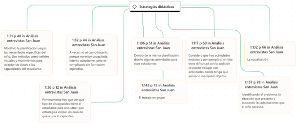 Las estrategias didácticas evidenciadas en la red de la Figura 9, son pocas e incluyen juegos de roles, trabajo grupal, señales visuales, manipulación de objetos, dependiendo de la condición del estudiante. Algunos docentes indican una nula aplicación porque desconocen cómo hacerlo, otros declaran hacerlo en la planificación sin precisar realmente lo que hacen.