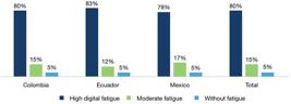 This study examines the impact of digitalization on the well-being of university faculty in Colombia, Ecuador, and Mexico, with an emphasis on digital fatigue resulting from the intensive use of virtual platforms. A mixed-methods design was employed, using interviews and surveys with 300 faculty members. Results show that 72% reported high stress levels, 65% experienced physical fatigue (including back and eye strain), and 60% reported an increased workload following the adoption of digital technologies. The study concludes that institutions must implement training programs and provide institutional support to reduce digital fatigue and strengthen the overall well-being of faculty.